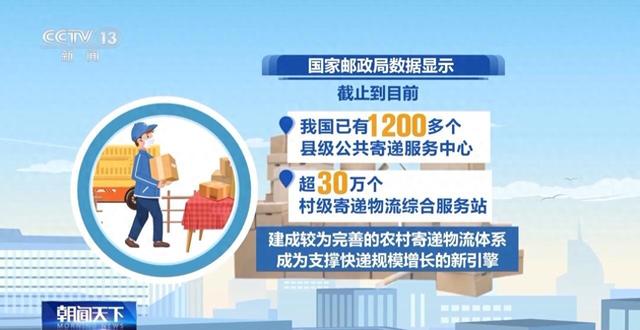 国家邮政局数据显示,截至目前,我国已有1200多个县级公共寄递服务中心、超30万个村级寄递物流综合服务站,建成较为完善的农村寄递物流体系,成为支撑快递规模增长的新引擎。