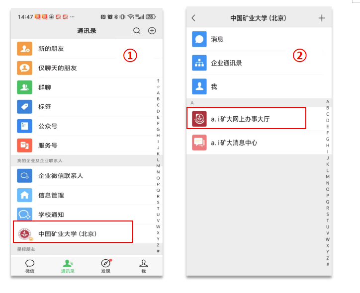 3.点击微信通讯录→“我的企业”里点击中国矿业大学(北京)→“i矿大”网上办事大厅。