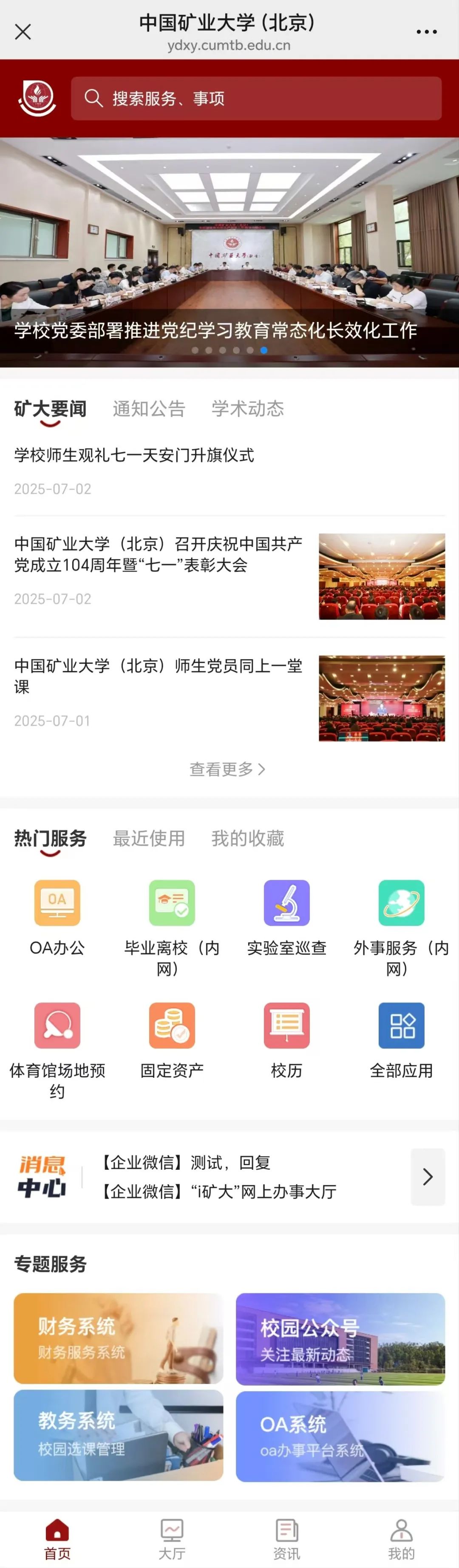 APP页面布局清晰直观,采用模块化设计,聚合高频服务和动态信息,一屏尽览,快速定位需求。资讯中心集中呈现矿大新闻、通知公告以及学术动态;服务应用根据最新点击率和用户偏好,展示热门服务、最近使用和我的收藏;消息中心确保即时获取最新消息提醒;专题服务整合专题类服务应用。