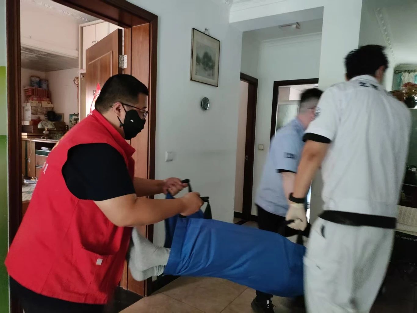 接到求助后,胡金鑫第一时间向居委会汇报情况,随即与社区工作人员赵宁、杨靖雯火速赶往居民家中。抵达现场后,众人迅速分工:胡金鑫协助医护人员,小心翼翼将章叔叔用担架抬至楼下救护车上,确保老人安全送医;赵宁、杨靖雯则一边细致叮嘱保姆带齐就医所需物品,一边温柔搀扶宋阿姨到房间休息,通过轻松的交谈缓解老人因突发状况产生的不安与焦虑。