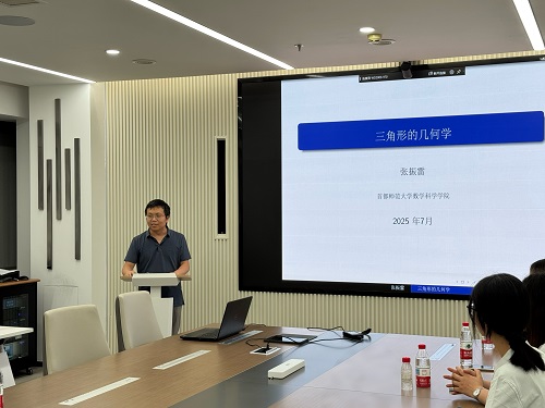 交流会上,张明向研学团师生简要介绍了首都师范大学和数学科学学院的情况。张振雷以《三角形的几何学》为题作报告,对几何和拓扑学的发展进行了简要介绍。报告后,双方就数学教师培养、拔尖创新人才培育等内容展开深入讨论并交换意见。