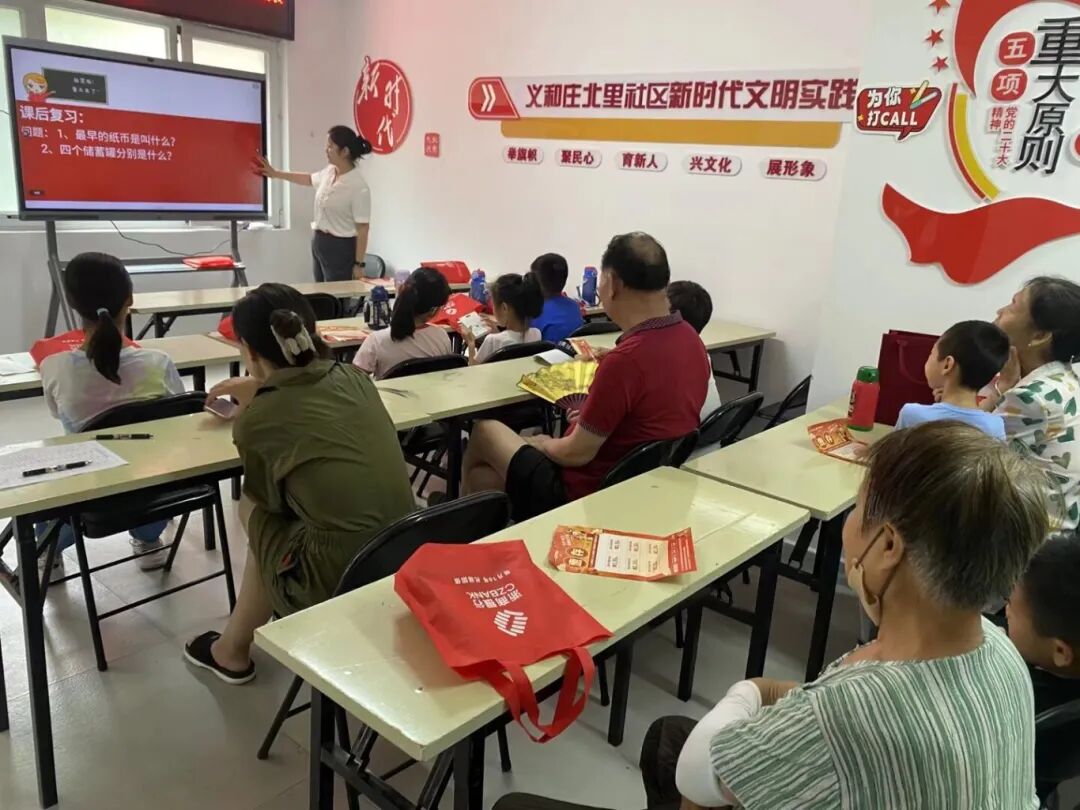义和庄北里社区新时代文明实践站开展的财商课堂更是热闹非凡,“我要存钱!”“这个能打折吗?”孩子们的声音此起彼伏,理财种子在欢声笑语中悄悄发芽。