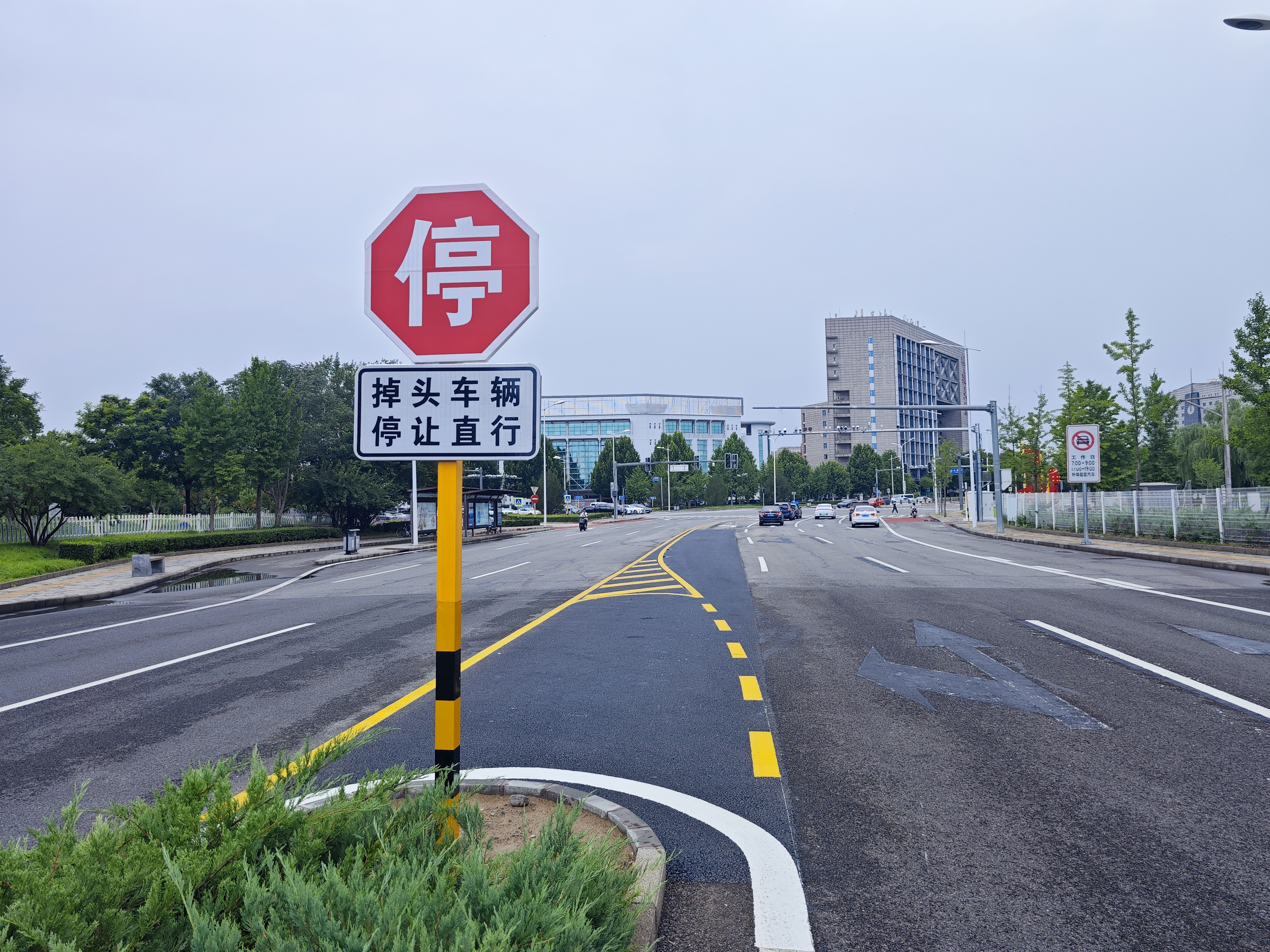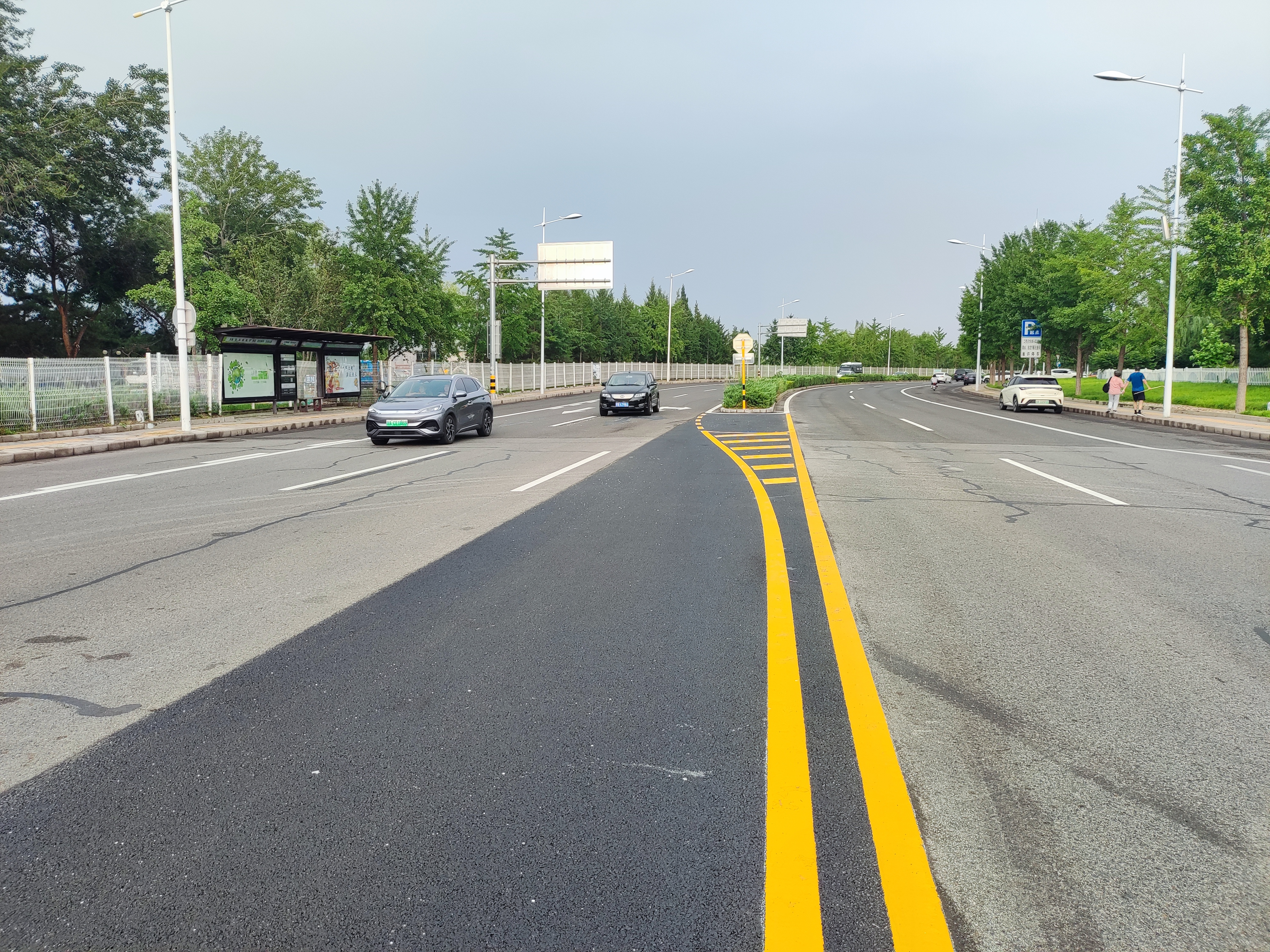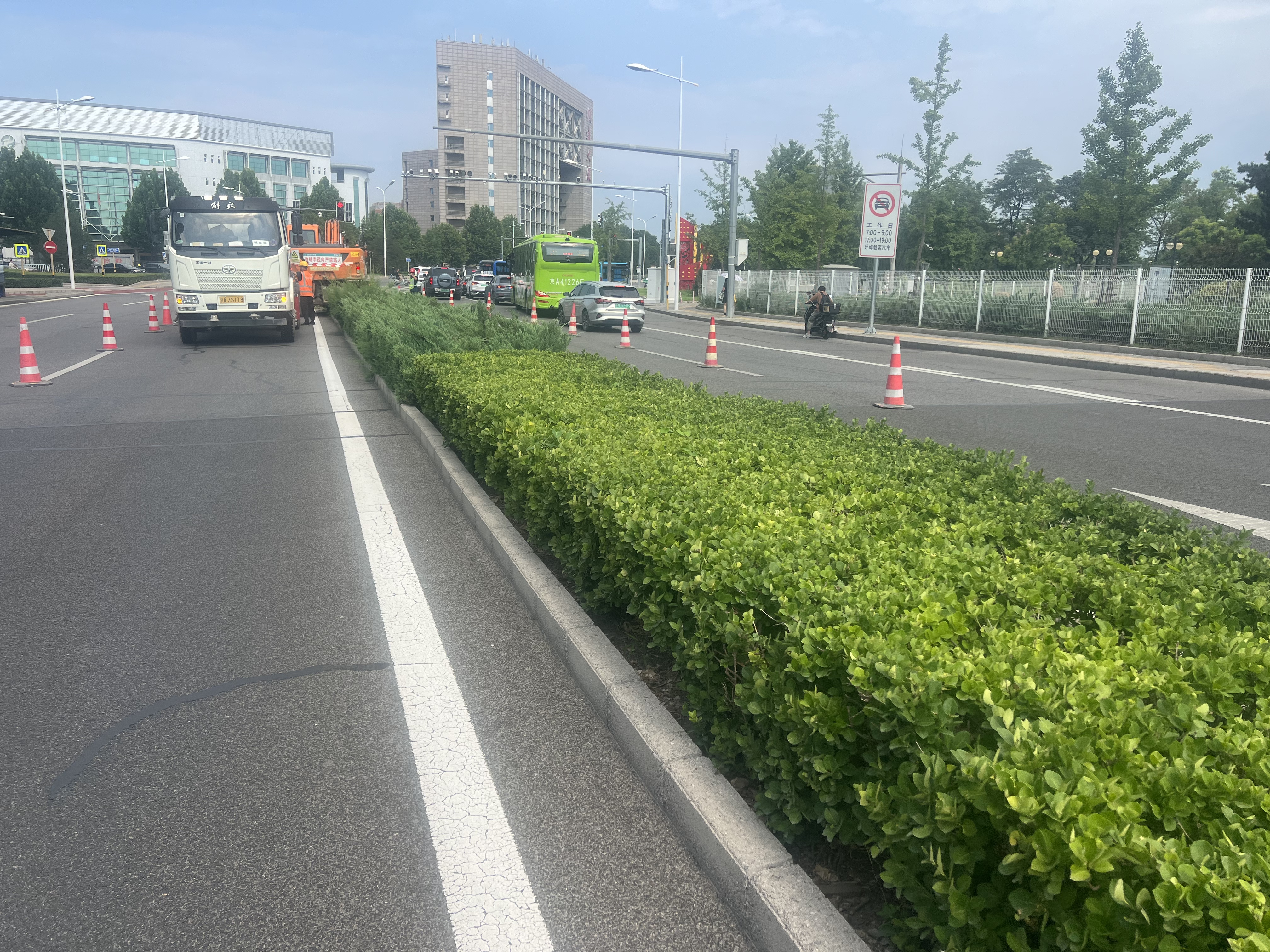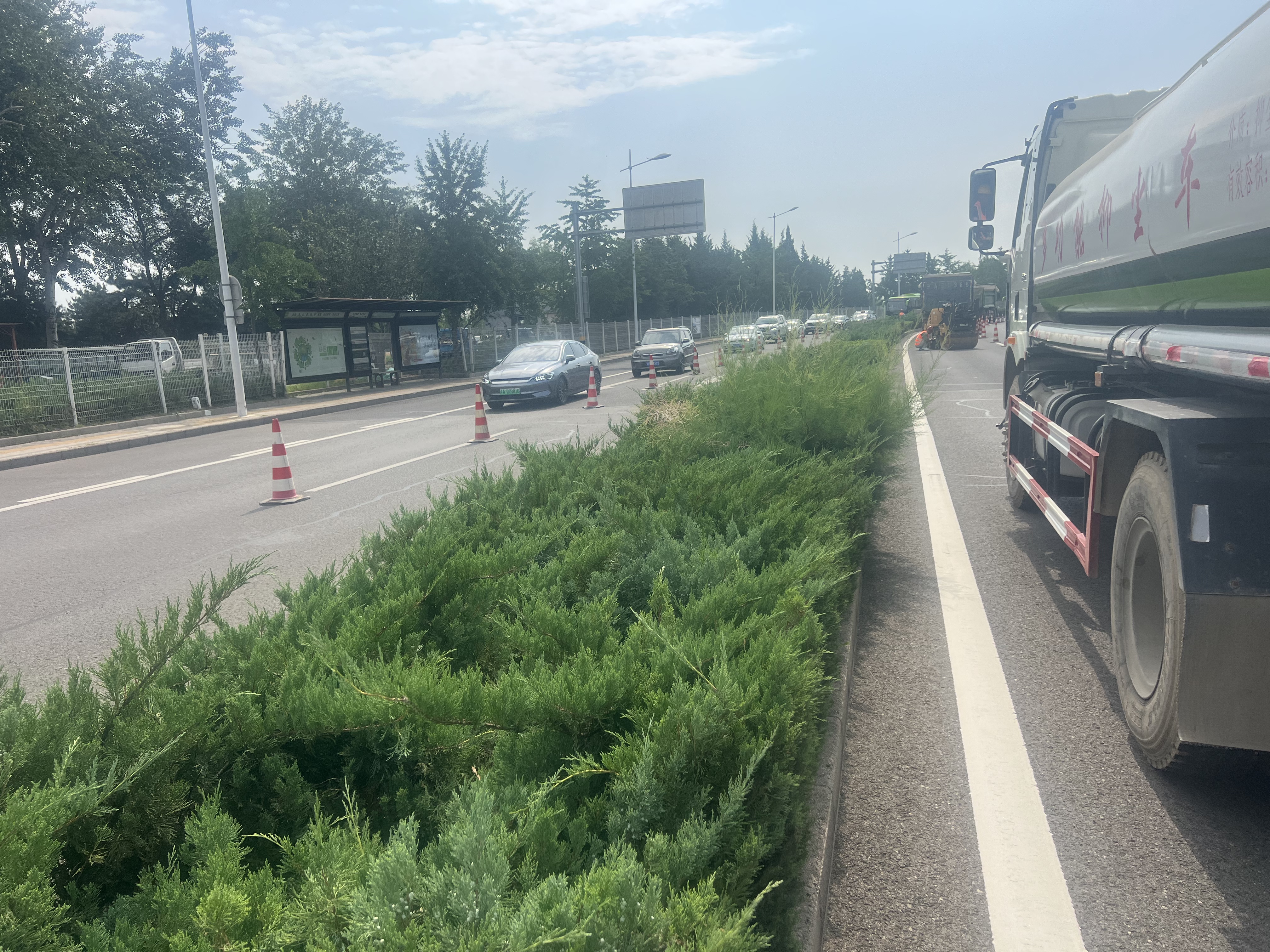 为缓解该区域道路节点拥堵、提升道路承载能力,顺义公路分局于6月24日组织市公安局顺义分局交通支队、区园林绿化服务中心及设计单位等前往现场,同步开展情况调研与勘察工作。经多方会商,确定通过拆除路口50米中央绿化带,改造路口渠化路段,延长左转弯专用车道长度,为机动车提供更充足的通行空间,减少直行车流对左转车流的干扰。工程同步优化通行区域规划,重新施划路口周边标线,并增设弯道反光道钉,提示驾驶员途经弯道时减速慢行。该工程已于7月7日进场施工,已于7月10日完工投用。