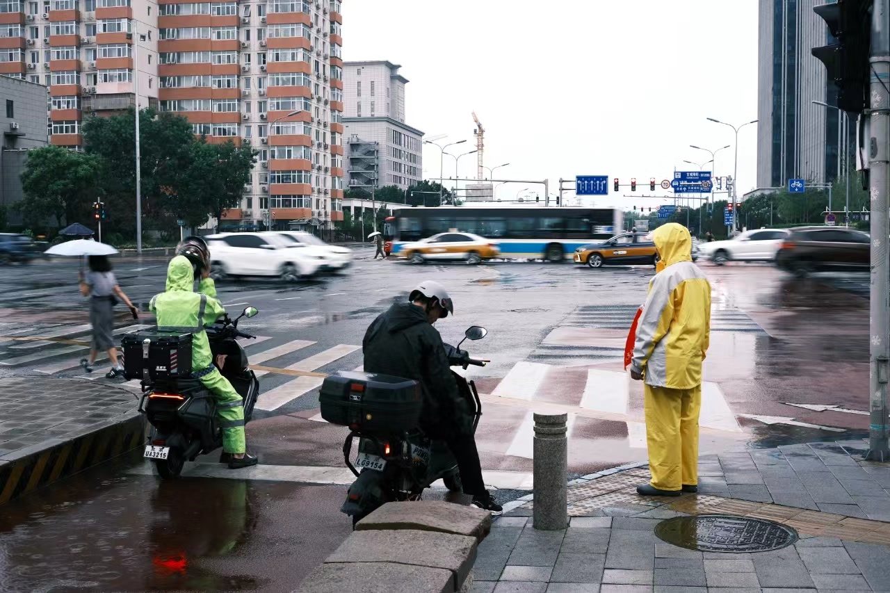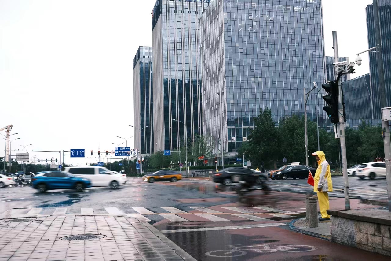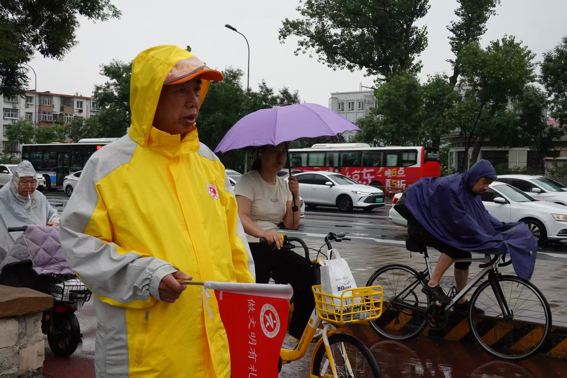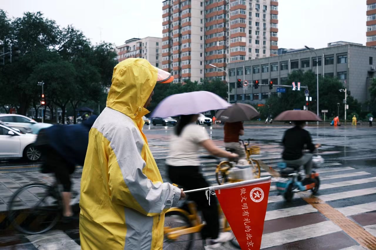 今天清晨,石景山区普降阵雨,在全区各主要道路路口、公交站点,文明引导员们始终坚守在岗位上,挥舞着手中的引导旗,指挥市民按序通过路口,登上公交车,他们用细心、贴心、暖心的服务,营造整洁、安全的出行环境,成为了雨中一道道靓丽的“风景”。