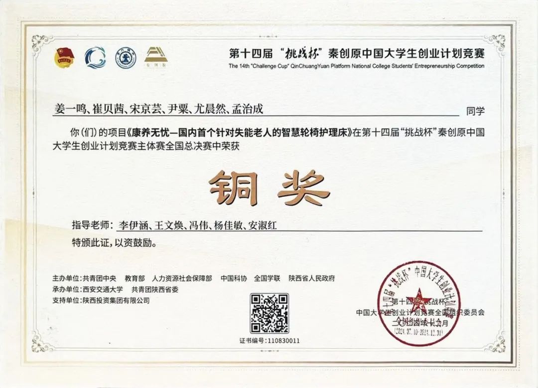 ▲2024年荣获“挑战杯”中国大学生创业计划竞赛国赛铜奖