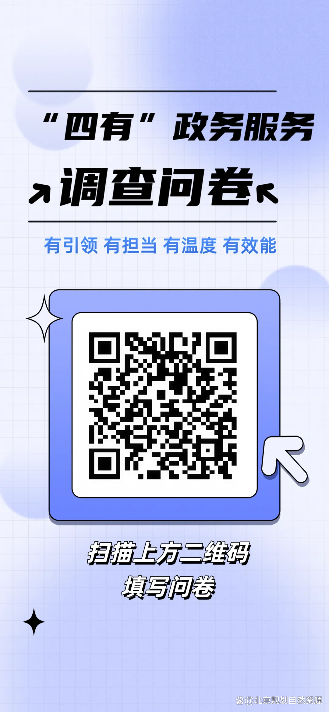 感谢您在百忙之中填写问卷,参与此次问卷调查,您将有机会成为特邀代表,走进北京市规划和自然资源委员会“‘四有’零距离 服务大家谈”座谈会现场!与工作人员零距离交流,深度对话,反映诉求,提供建议,共谋服务提升良策。
