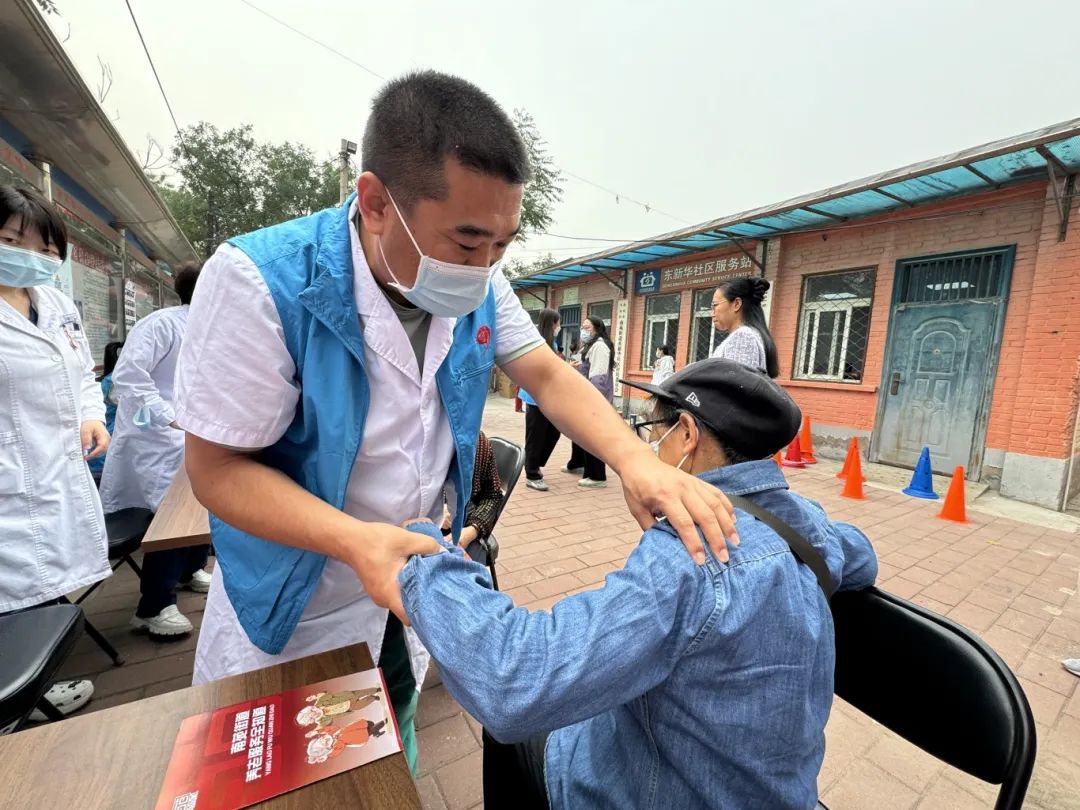 回到北京后,贾忠宝服务群众的脚步也从未停歇。多年来,他进社区、驻公园开展义诊数十场,用脚步丈量责任,用行动诠释担当。2024 年 9 月,党建第三片区成员单位和义社区卫生服务中心打来求助电话:一位骨折术后老人行动不便,急需换药检查。刚结束门诊的贾忠宝顾不上休息,带着器械直奔老人家中。消毒、检查、换药、指导后续护理,一系列操作有条不紊。老人感动不已:“现在的医生真是把服务送到了家里!”