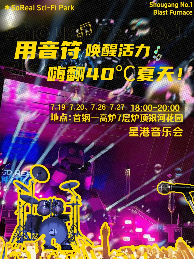 音符唤醒夏日活力,首钢一高炉7F炉顶露天花园,40米高空,与夕阳并肩的浪漫约会,来这儿俯瞰京西夜景,吹晚风,观日落,听音乐环绕!