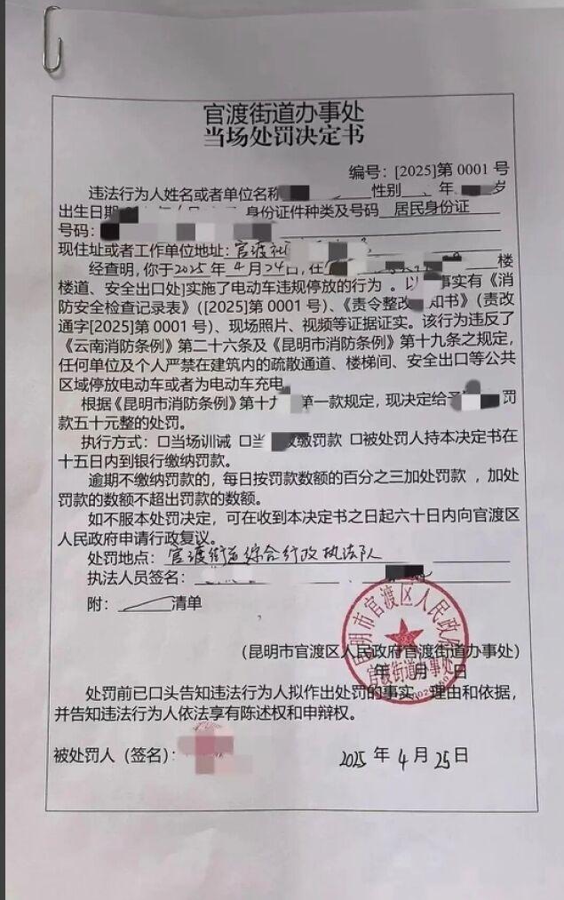4月25日,昆明市官渡区官渡街道对某社区周某多次违规停放电单车且拒不整改的行为,依法开出2025年全区首张50元个人罚单。这是该街道获赋电动车违规停放行政处罚权后开出的首张罚单,标志着当地对电单车消防安全整治从“劝导教育”阶段迈入“执法处罚+长效管理”新阶段。据悉,今年开展工作以来,街道共下发23份当场处罚决定书,整改率达100%。
