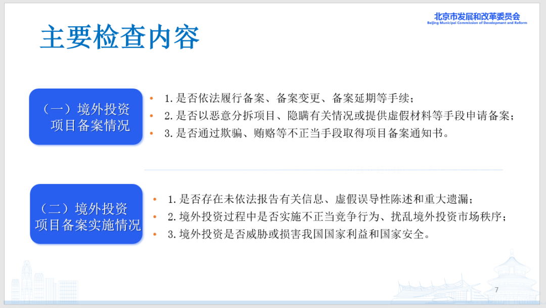 根据2025年度执法工作安排,深化执法与普法宣传相结合,优化境外投资综合服务,完善境外投资全程监管,促进境外投资持续健康发展,近日,北京市发展改革委组织召开2025年北京市境外投资备案检查工作培训会,共计200余人次参会。本次培训旨在通过权威政策解读和实践案例分享,帮助参训人员全面掌握企业境外投资备案领域的最新动态、政策法规,进一步提升其专业素养和实际操作能力。