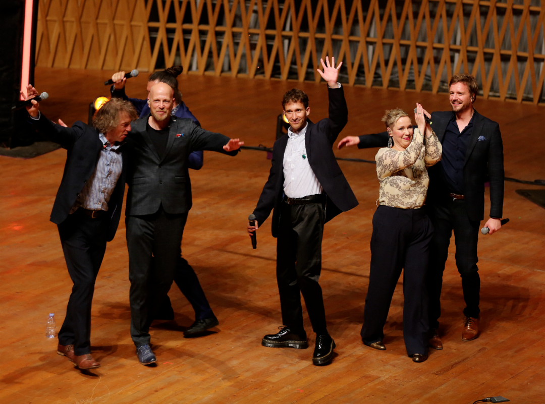 其次,巴赫的器乐难度上限往往比声乐作品大,尤其是连续的包含大跳进的琶音,而且人声需要换气点,怎么唱?SLIXS的选择是把旋律交给两个声部进行“抛接”,从而实现无缝的连接。但他们的安排不是死板的两人每人一句或半句,而是让旋律的“接缝处”不时地变动,增加了舞台的趣味性和亲密感。至于连续快速大跳造成的声区转换和音准的困难,则是避无可避,因此现场难免也有些许的音准瑕疵和声带疲劳感。