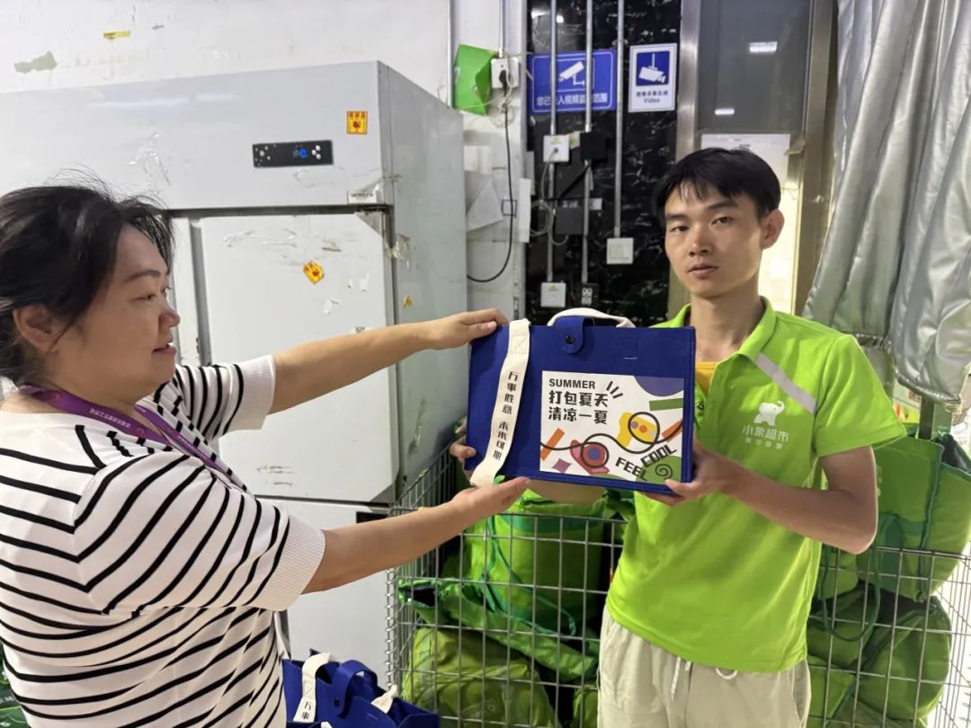 活动中,工作人员先后前往各点位,为在高温下坚守岗位的劳动者们送上清凉包和消暑饮料,帮助新就业群体应对酷暑挑战。京东分拣员小李表示:“天气炎热,工作强度大,这些防暑物品太及时!”