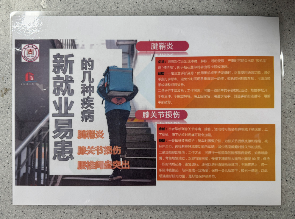 此外,工作站还向新就业群体发放了服务包宣传手册,详细介绍免费法律咨询、健康义诊、技能培训等服务资源,以及周边友好餐厅、休息区、充电站等实用信息,助力他们高效获取支持。