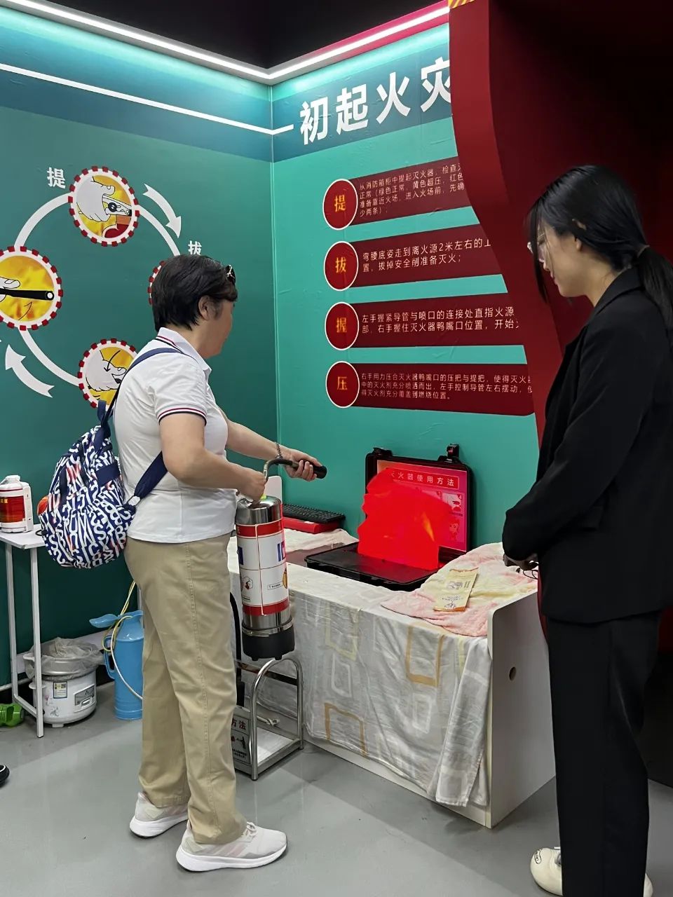 灭火器使用教学区,居民在讲解员指导下轮流操作,“提、拔、握、压——对准火焰根部”的步骤逐渐熟练。模拟火灾现场逃生演练紧张有序,大家用湿毛巾捂住口鼻,弯腰低姿快速撤离,亲身体验“不乘电梯、不贪财物”的逃生原则。