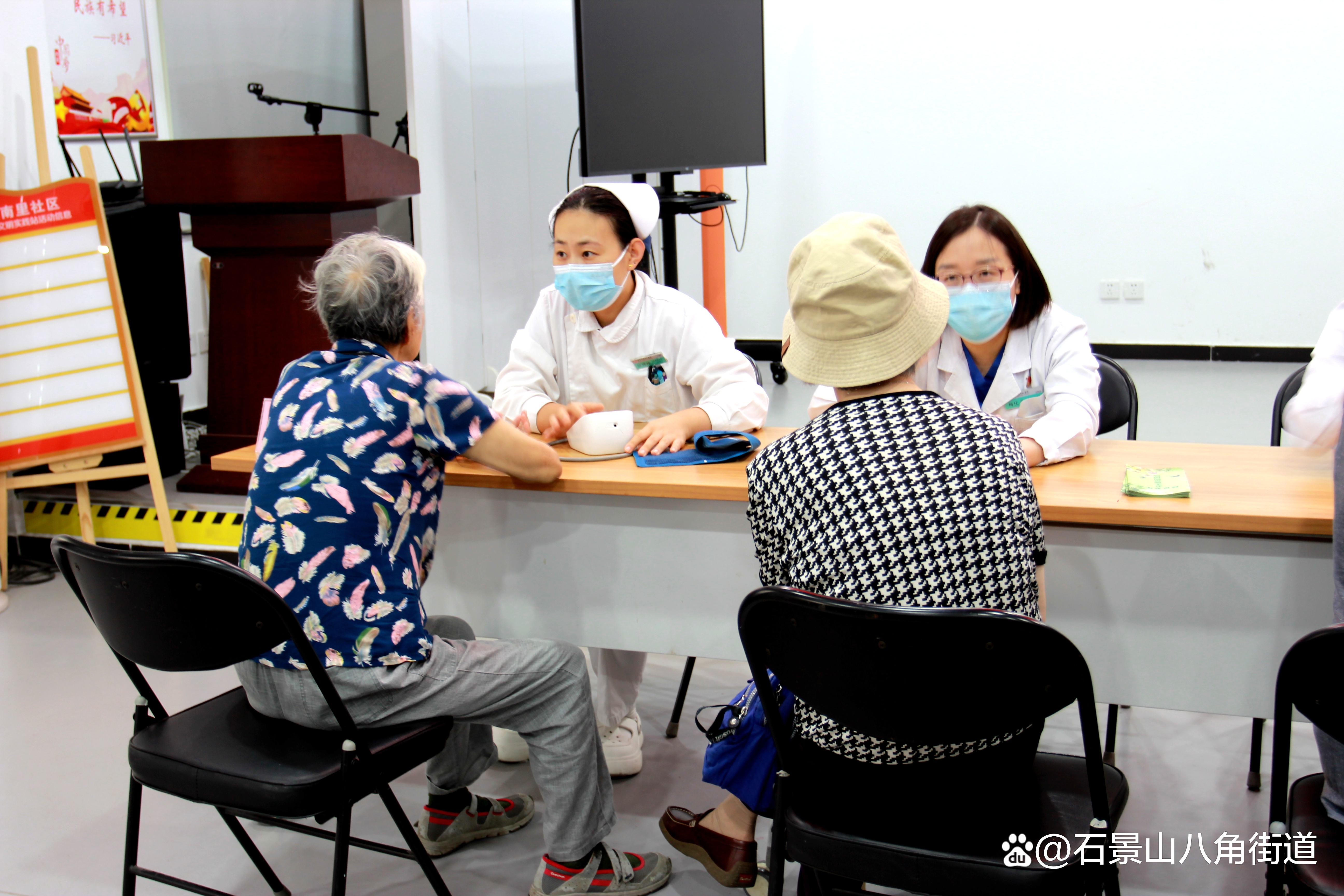 药剂科的大夫为老年居民讲解安全用药知识。针对老年人常患疾病的用药注意事项、药物相互作用以及如何正确储存药品等问题。护士也在忙碌地为老人们测量血压。她们态度温和、操作熟练,一边测量,一边耐心地向老人讲解血压相关知识以及日常血压监测的重要性。对于血压偏高的老人,护士们会详细记录数据,并建议他们及时就医,调整生活方式。