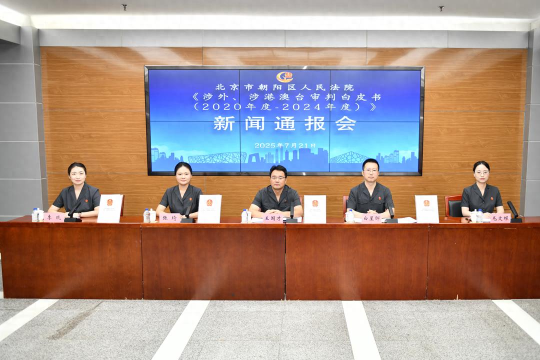 2020年至2024年共审结涉外、涉港澳台案件4235件,涉及70余种案由、60余个国家和地区,7月21日,北京朝阳法院召开新闻通报会,发布《涉外、涉港澳台审判白皮书(2020年度-2024年度)》,通报其近五年涉外、涉港澳台案件的审理情况、特点,相关工作举措成效及典型案例。北京市人大代表王清友,朝阳区人大代表聂学群,朝阳区政协委员钟瑾、黄文娟现场参会。中国日报、法治日报、光明网、北京广播电视台、北京青年报、北京政法网、朝阳有线等多家媒体关注报道。