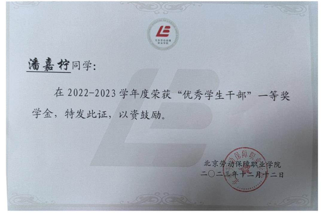 ▲2022-2023学年荣获“优秀学生干部”一等奖学金