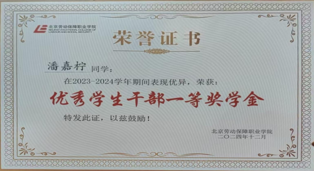 在学习方面,潘嘉柠在读期间始终保持优异表现,连续三年学业成绩与综合测评稳居专业前三。曾荣获两次优秀学生干部一等奖学金,两次"优秀共青团干部"荣誉称号。
