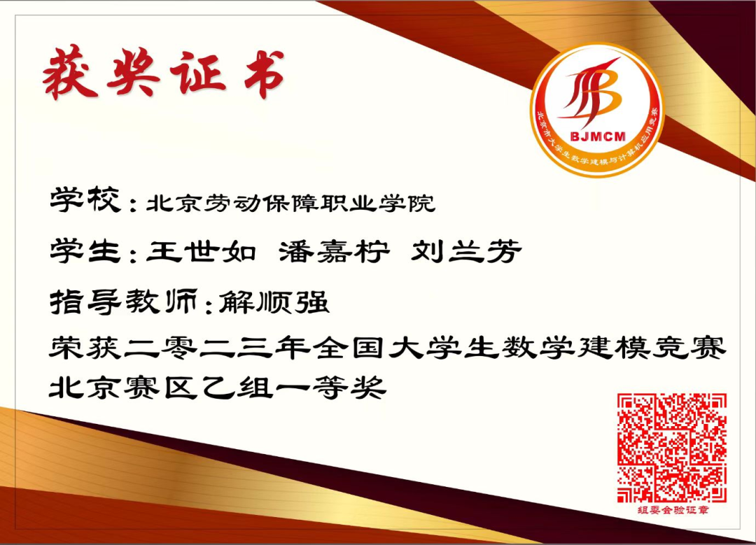 ▲2023年荣获全国大学生数学建模竞赛北京赛区一等奖