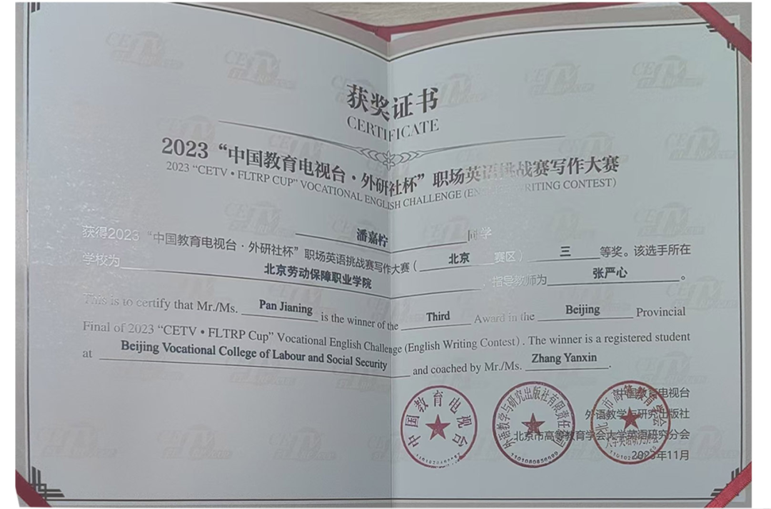 ▲2023年荣获“中国教育电视台.外研社杯”职场英语写作大赛北京赛区三等奖