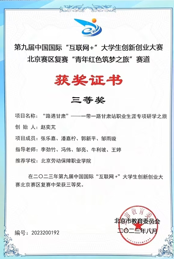 ▲2023年荣获第九届中国国际"互联网+"大学生创新创业大赛北京市赛三等奖