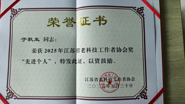 于秋生荣获2025年江苏省老科技工作者协会奖先进个人