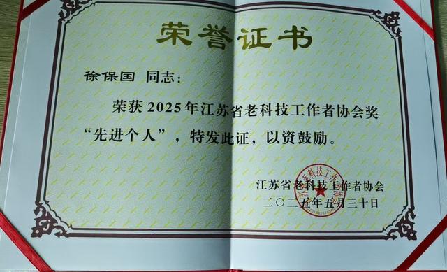 徐保国荣获2025年江苏省老科技工作者协会奖先进个人