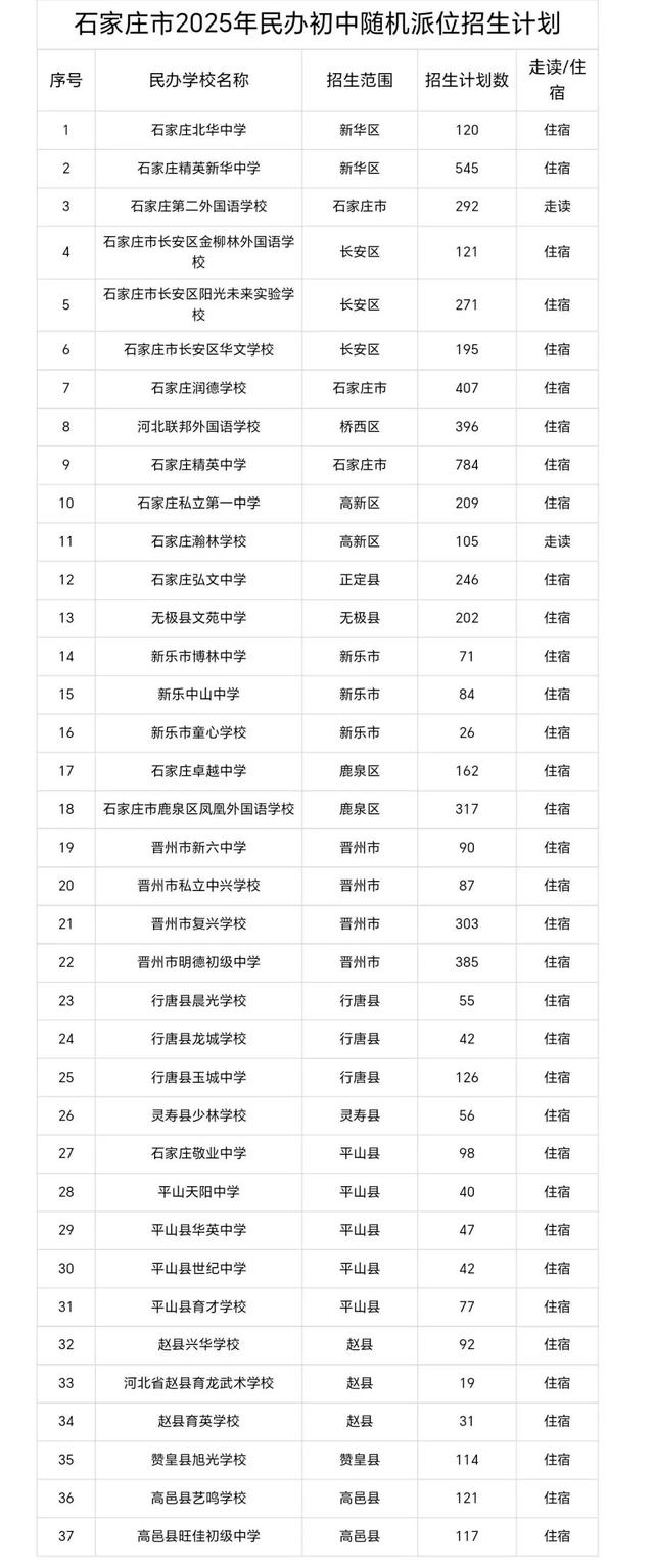 石家庄市2025年民办初中随机派位招生计划