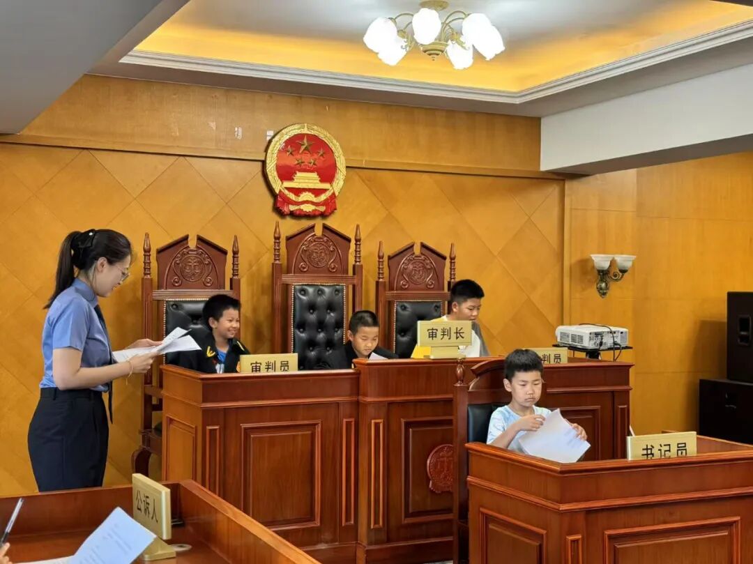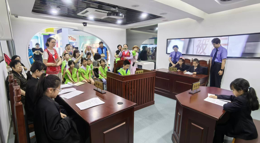 在讲解员的带领下,孩子们参观了法治教育中心的六大展厅,全方位、立体式地了解宪法教育、犯罪预防教育、安全自护教育、家庭教育等内容。在检察官的引导下,孩子们分别扮演公诉人、审判长、审判员、辩护人、被告人等角色,共同参与模拟法庭活动。同时,检察官结合真实案例,为孩子们讲解未成年人犯罪预防、自我保护等法律知识,于润物无声中引导孩子们远离违法犯罪,筑牢法治意识,学会用法治思维、法律方式解决问题、捍卫权益。