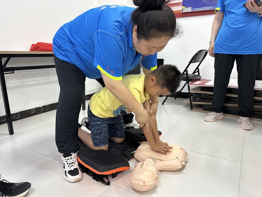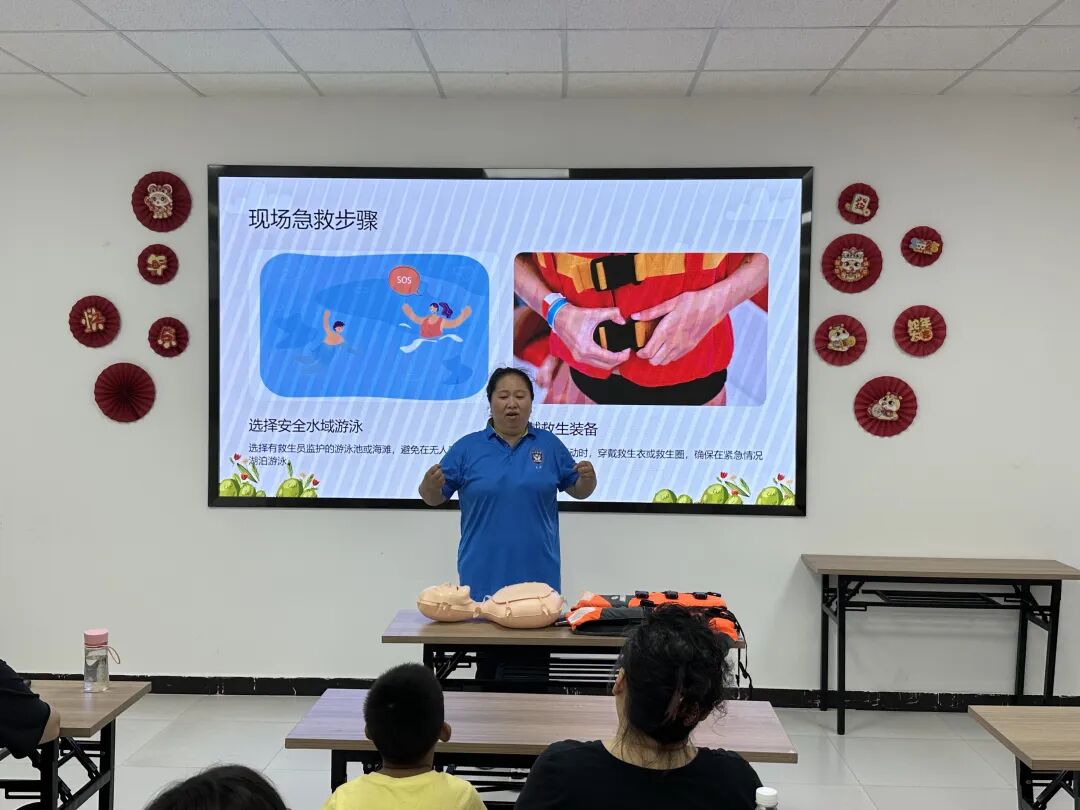 授课老师以通俗易懂的语言,详细讲解溺水急救与防溺水基本知识,从识别“远离野外危险水域”的警示标识,到阐释“黄金救援四分钟”原则,从不慎落水时的仰漂自救技巧,到同伴遇险时的智慧救援方法,再到心肺复苏操作流程,并结合实际操作演练,引导孩子们强化安全与自我保护意识。活动还通过放映防溺水宣传视频,提醒家长们要切实履行监护责任,做好孩子日常安全监管,共同营造安全、健康的生活环境。