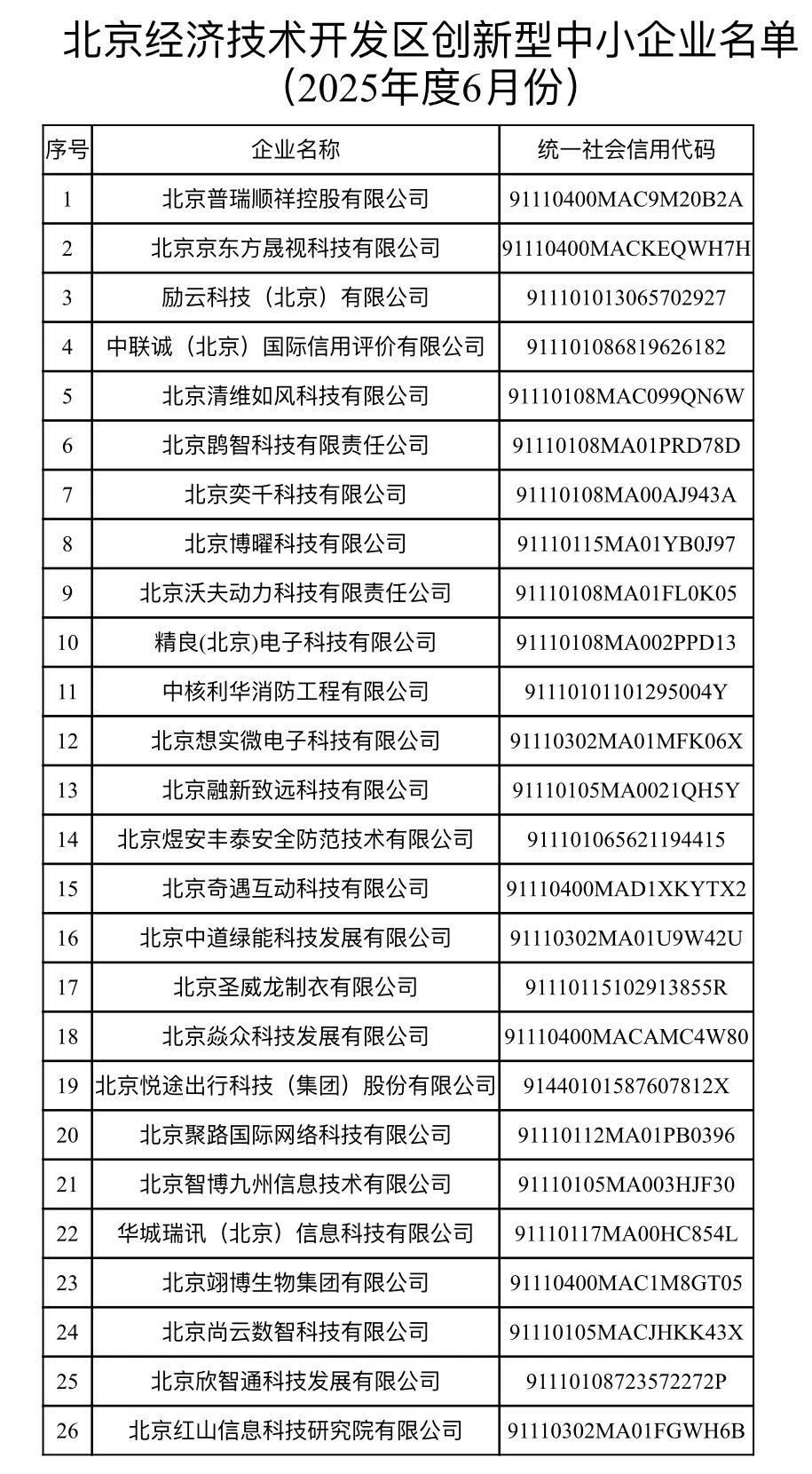 为深入贯彻落实国家及北京市关于优质中小企业梯度培育的重要举措,进一步激发区域创新活力,北京经济技术开发区(北京亦庄)积极推进创新型中小企业的培育与认定工作。经相关程序,2025年度6月份经开区创新型中小企业名单已确认。