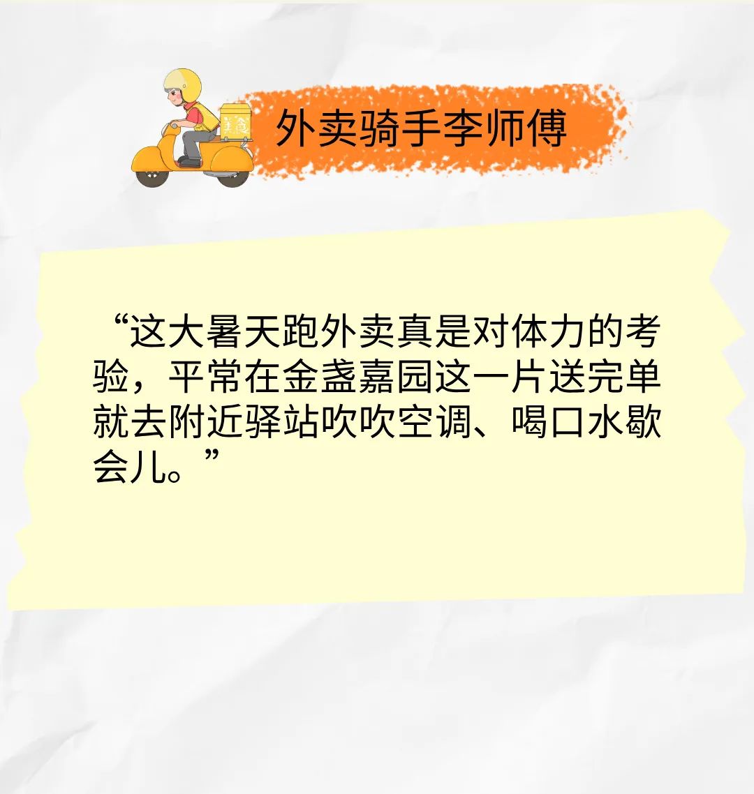 在这样酷热难耐的天气里,外卖小哥、快递员们依然顶着烈日穿梭在金盏的街头。金盏地区也始终牵挂着这些新就业群体,通过工会送清凉、建驿站等举措为他们保驾护航。