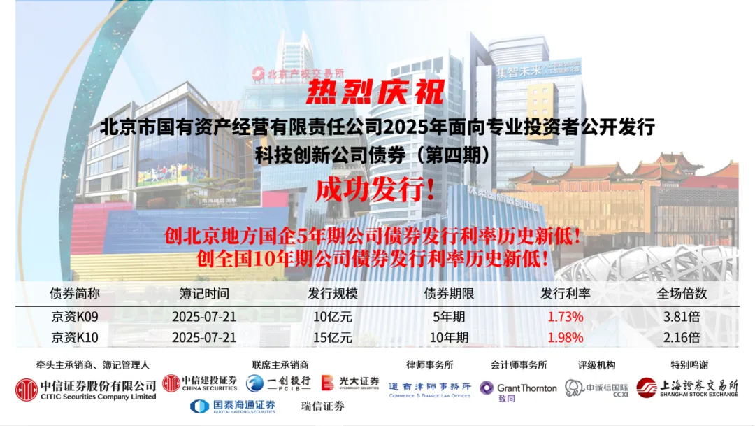 7月21日,北京市国有资产经营有限责任公司(以下简称北京国资公司)在上交所成功发行2025年第四期科技创新公司债券,发行规模25亿元。本期科技创新公司债券的发行,采用双期限互拨形式,其中25京资K9发行规模10亿元,期限5年,票面利率1.73%,创北京地方国企同期限公司债券发行利率历史新低;25京资K10发行规模15亿元,期限10年,票面利率1.98%,创全国同期限公司债券发行利率历史新低。