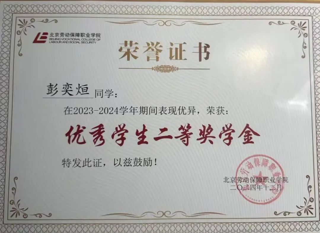 ▲2023-2024学年荣获“优秀学生”二等奖学金