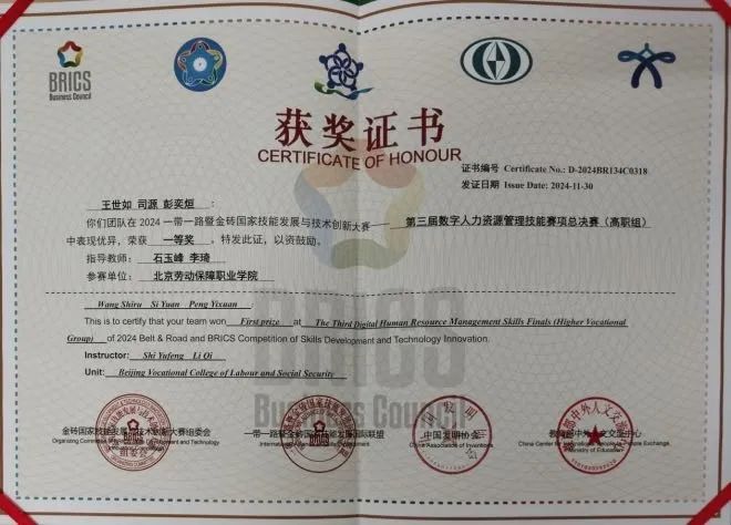 ▲2024年荣获 “第三届数字人力资源管理技能赛项总决赛”(高职组)一等奖