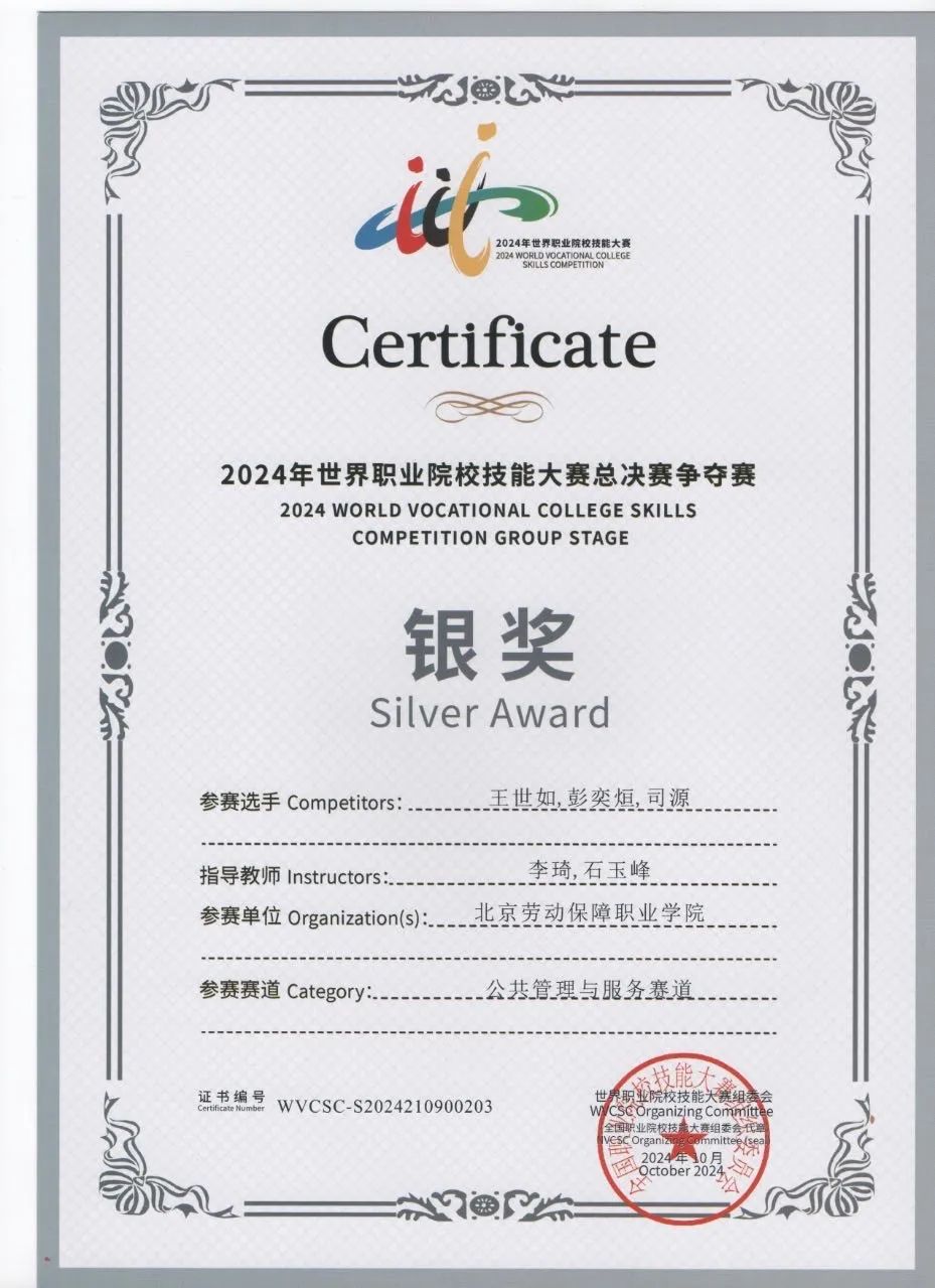 ▲2024年荣获世界职业院校技能大赛总决赛争夺赛公共管理与服务赛道银奖