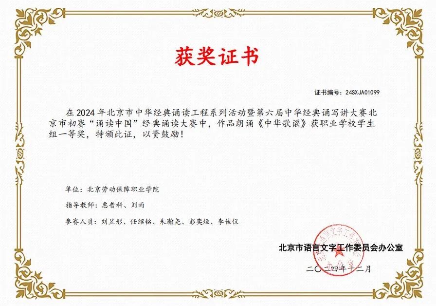 ▲2024年荣获第六届中华经典诵写讲大赛北京市初赛一等奖
