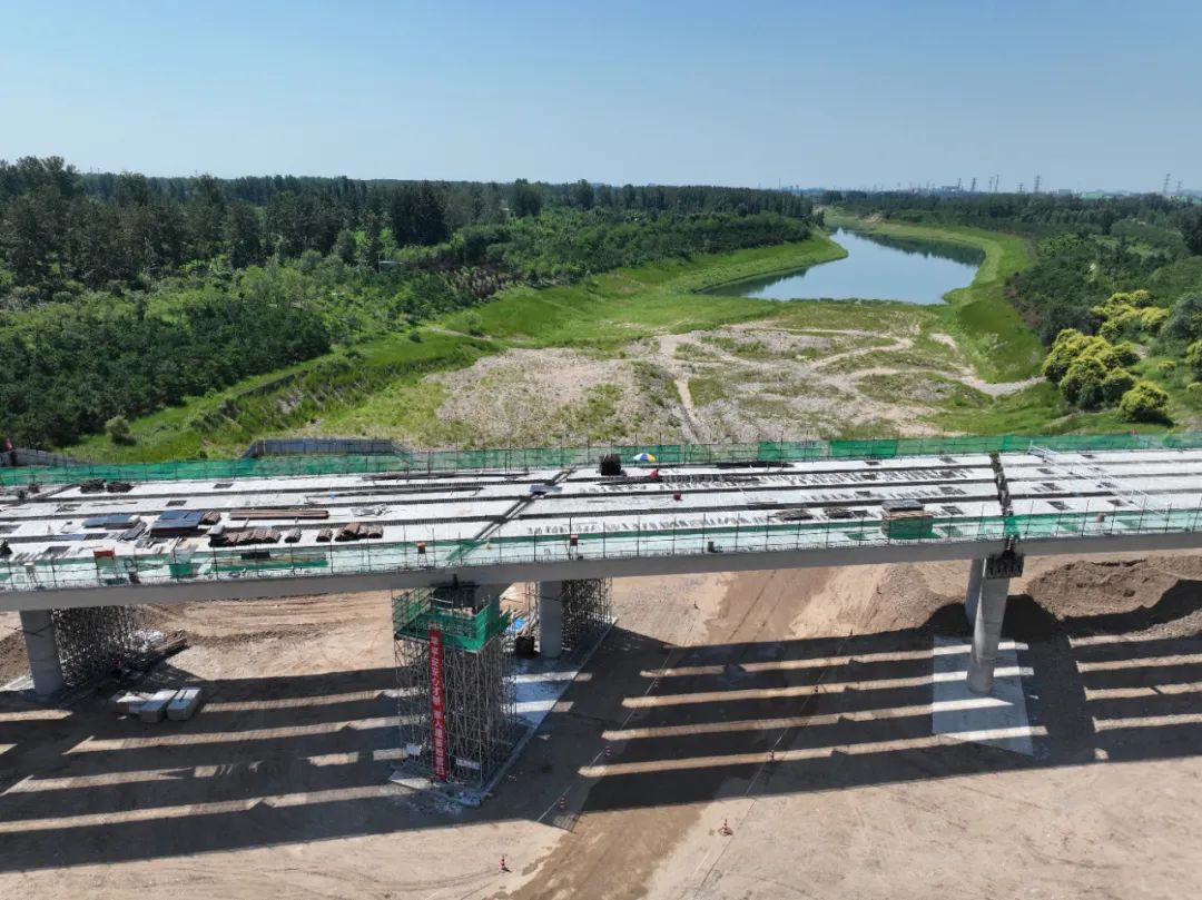 近日,密新路改建工程迎来重要建设节点——跨沙河大桥进行梁体吊装作业。作为密新路改建工程的关键部分,跨沙河大桥于2024年11月开工建设,全长206米,桥面宽17米,上部结构为预应力混凝土箱梁,箱梁最大长度35米,最大重量132吨。
