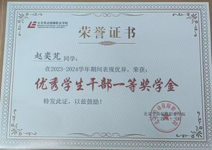 ▲2022-2023学年荣获“优秀学生干部”一等奖学金
