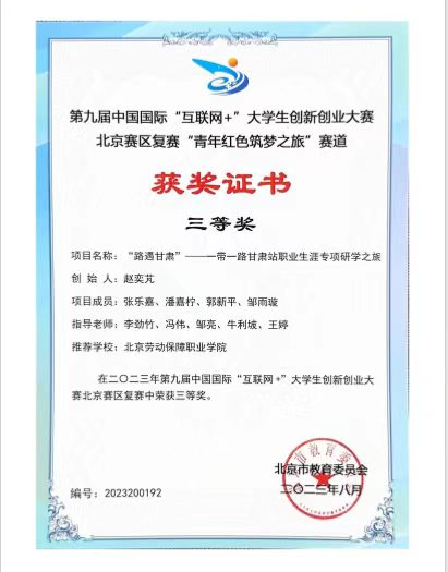 ▲2023年荣获第九届中国国际“互联网+”大学生创新创业大赛北京赛区复赛“青年红色筑梦之旅”赛道三等奖