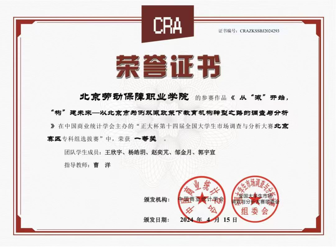 ▲2024年荣获正大杯第十四届全国大学生市场调查与分析大赛北京赛区专科选拔组一等奖
