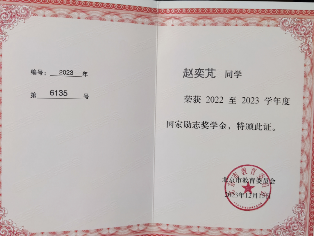 赵奕芃自入学来,始终以高标准严格要求自己,在学习、实践、竞赛等各个领域不断拼搏,收获了许多宝贵的经历与荣誉,专业成绩一直名列前茅,曾获得国家奖学金、国家励志奖学金、校级优秀学生一等奖学金。