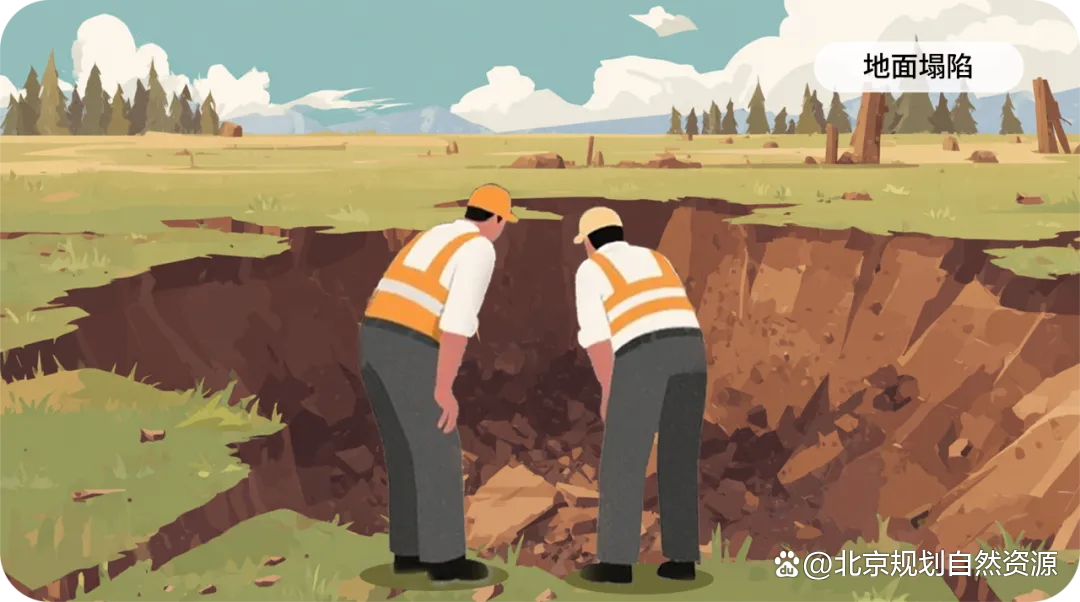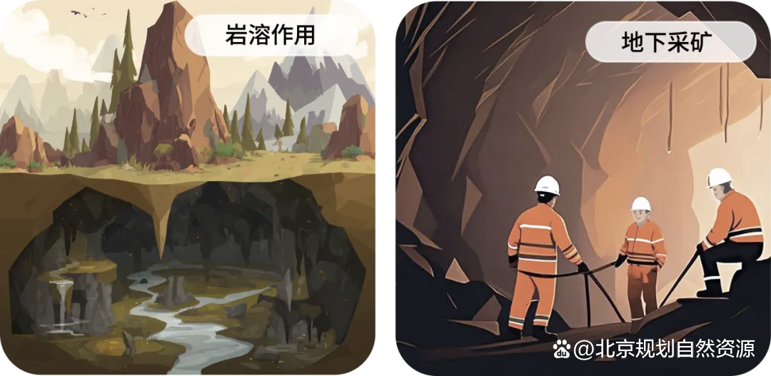 地下采矿、工程活动、岩溶作用等会产生地下空洞,在地震、暴雨的影响下可能导致围岩失稳、开裂、垮落,进而引起土体覆盖层向下陷落,引发地面塌陷。