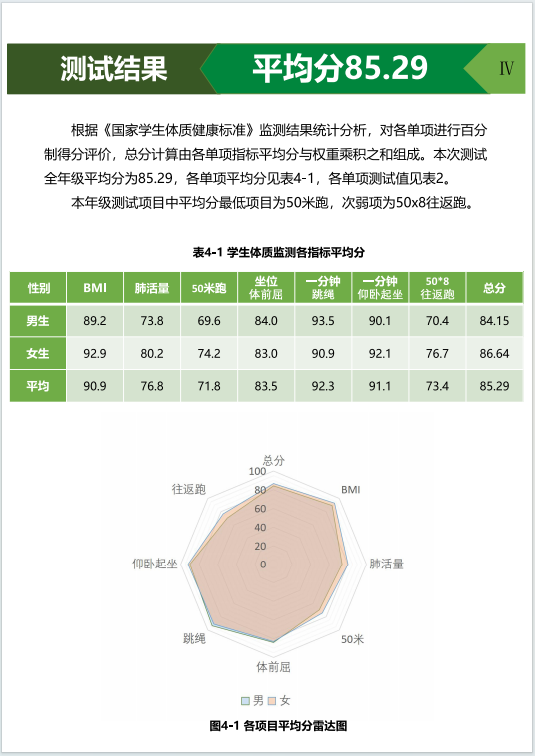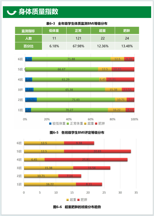 在精准分析方面,针对市区、学校、年级、班级、学生等各层级关注重点,生成分析报告,项目组采用多层级、多维度分析形式,以基础测量数据为基础,报告通过表格、数据图表等形式进行精准分析,简洁明了地展示各类数据,帮助各层级管理者了解体质情况,协助制定干预方案。