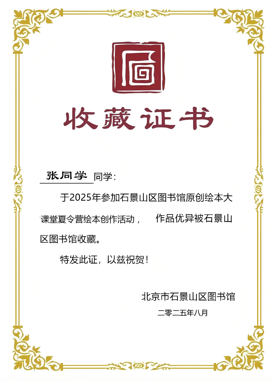 收藏证书示例