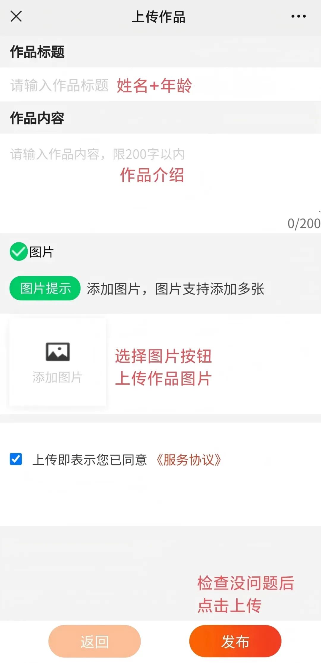 ② 上传时必须要填写以下内容:创作人姓名、创作人年龄和联系电话。