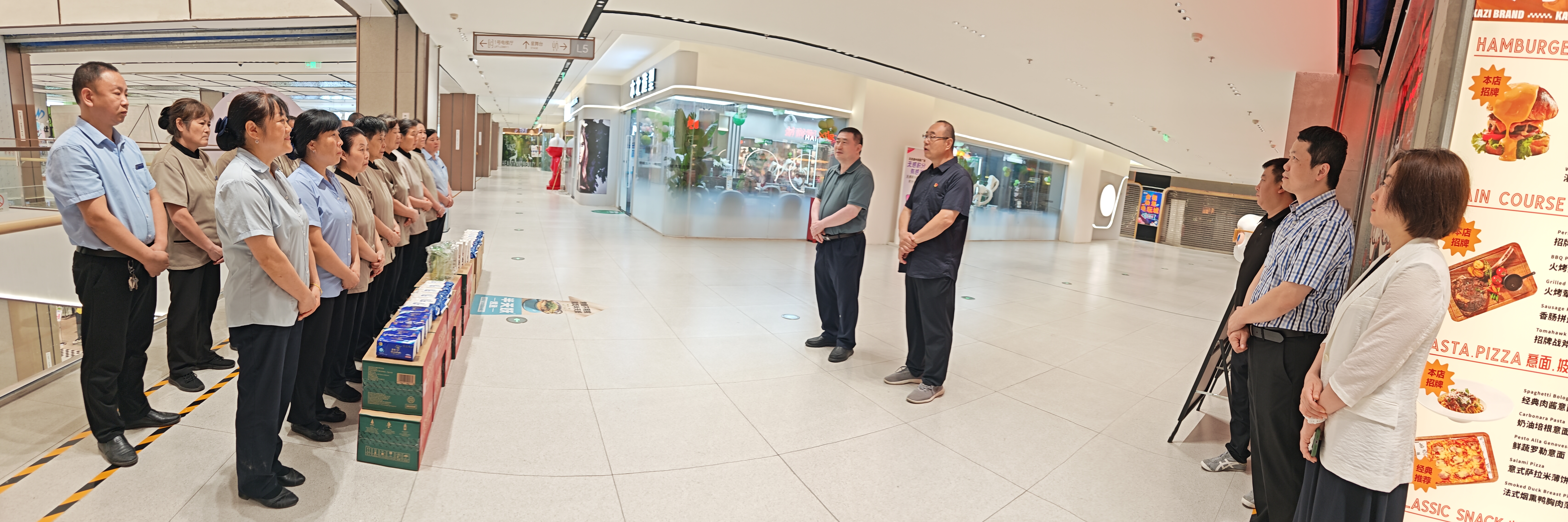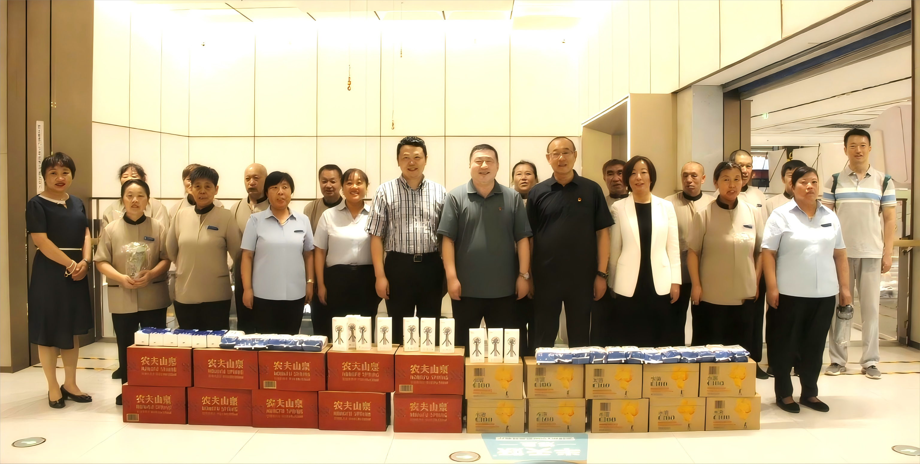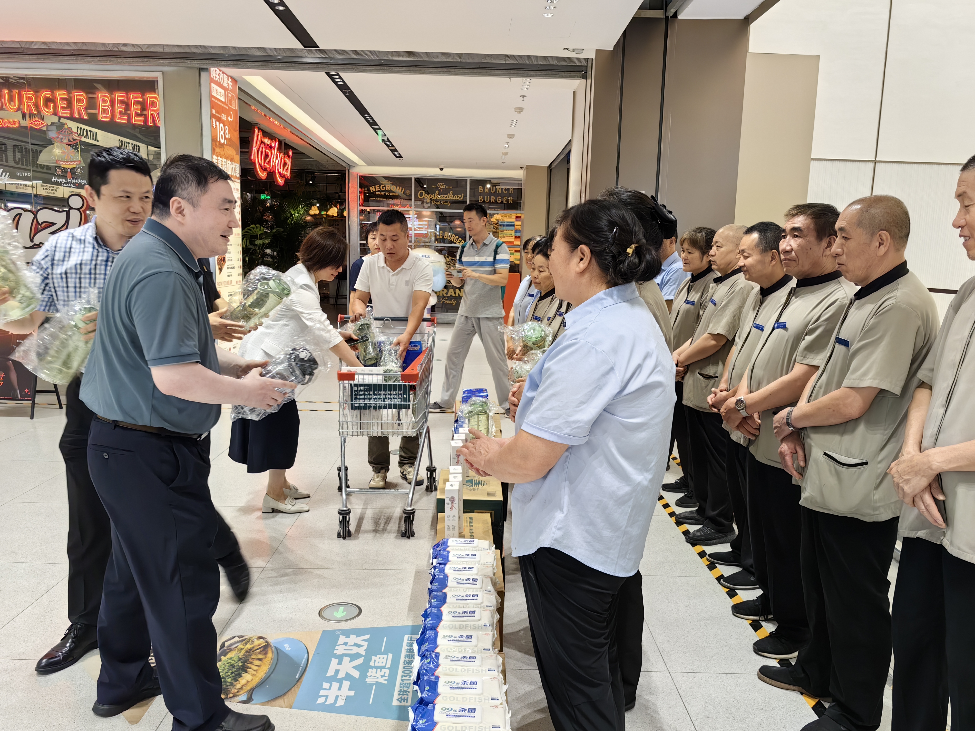 七月的北京,暑气正盛。北京市服务工会主席李东明,副主席林林、孔蕴珈,干事耿天成,北京市清洁行业工会联合会副主席张永红,北京清洁行业协会流动党员党支部书记、会长翟佳梁,以及北京开元昌明清洁服务有限公司工会主席董岩等一行来到通州领展广场项目,将防暑降温物资与贴心关怀一同送到职工手中。