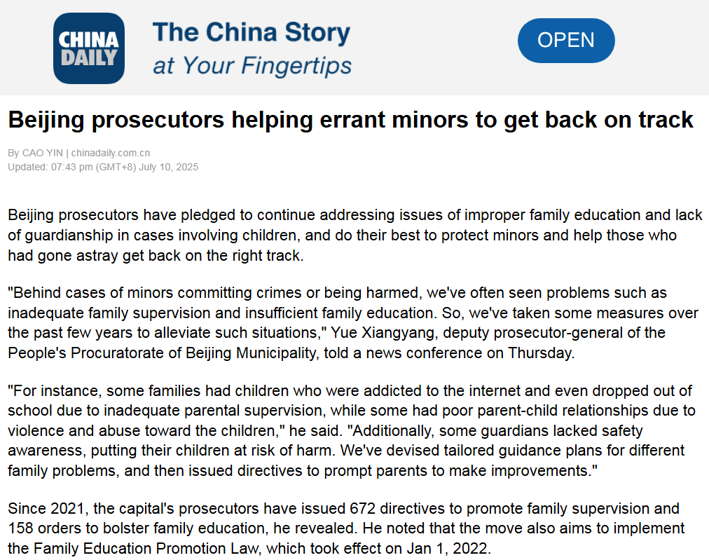 7月10日,中国日报客户端报道《Beijing prosecutors helping errant minors to get back on track》。