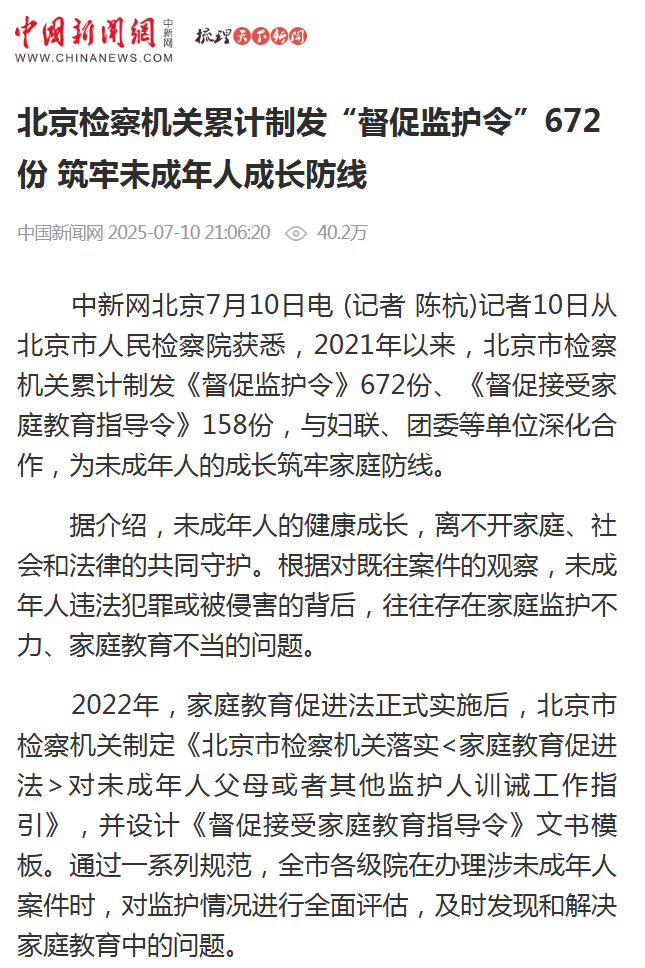 7月10日,中国新闻网报道《北京检察机关累计制发“督促监护令”672份 筑牢未成年人成长防线》。