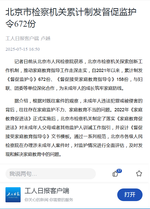 7月15日,工人日报客户端报道《北京市检察机关累计制发督促监护令672份》。